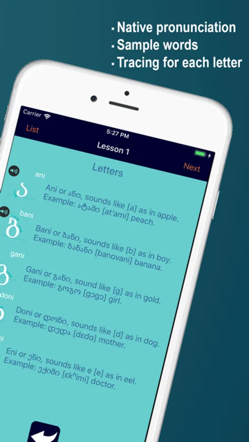 Georgian Alphabet Now App is a teaching tool to help you learn to read and write the Georgian alphabet, Mkhedruli. The entire alphabet is presented in 8 lessons.