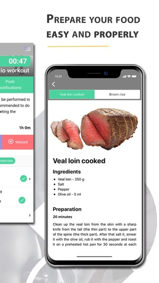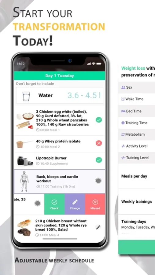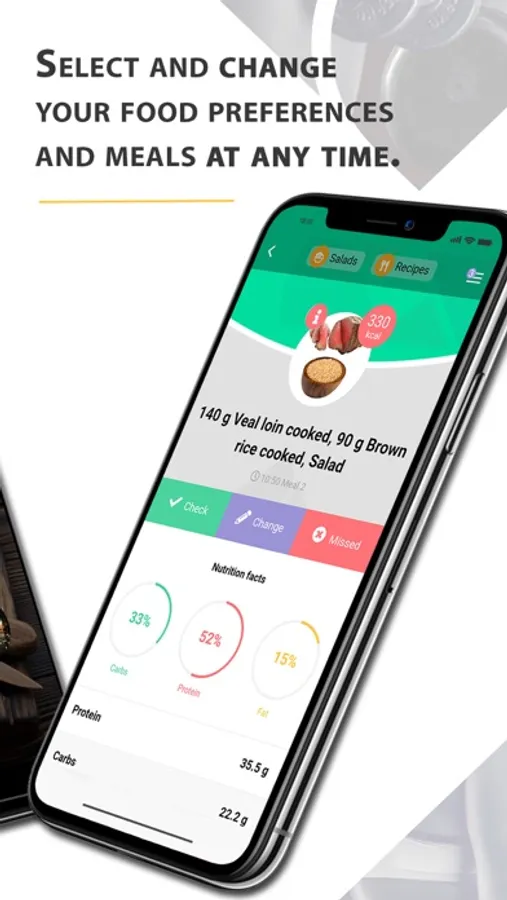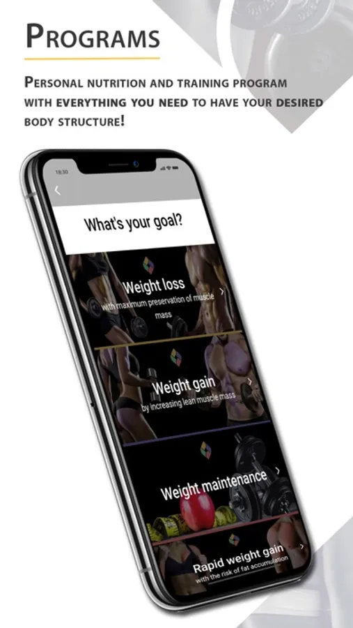 • The nutrition program takes into account your goal, sex, age, weight, metabolism, level of activity and percentage of body fat.