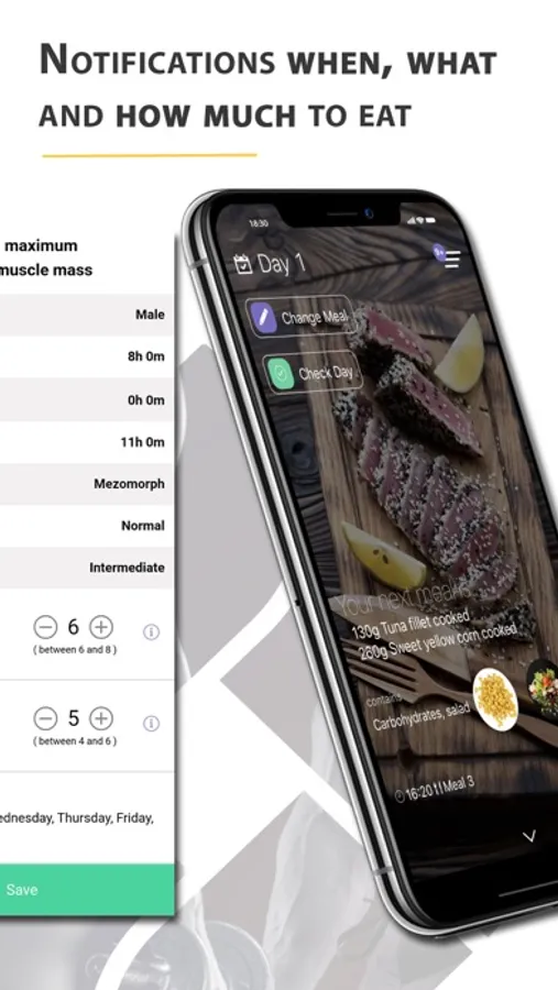 • Distributed throughout the day meals based on your selected sleep and training hours.