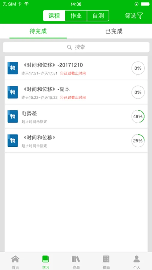 ②学习模块:包含课程、作业、自测三个部分,点击后可进入课程、作业、自测列表。