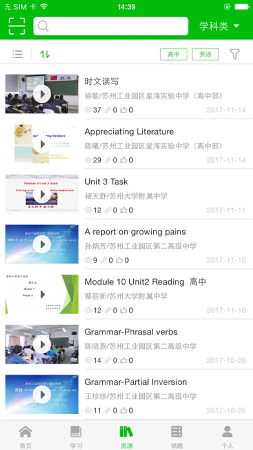 ③资源模块:资源分为学科类和特色类资源,包含视频、文档、测验、题库等各种形式的资源。