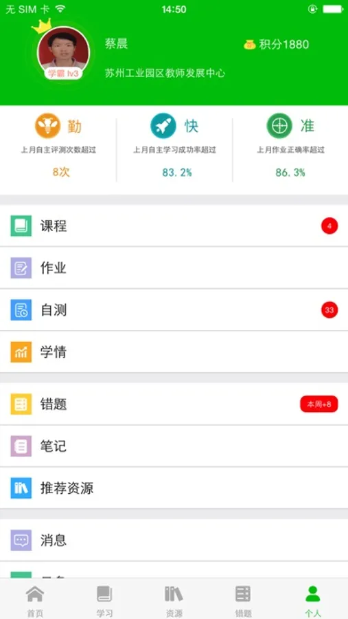 ①首页模块:包含学生基本信息,待完成的课程和作业,及课程、自测、错题、笔记、推荐资源、云盘、学情等应用模块的入口,点击个图标可进入相应的页面。