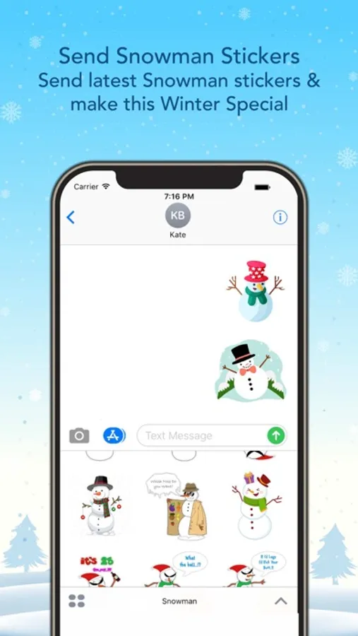 Find a funny collection of snowman stickers for this christmas holiday. All stickers are unique and high quality. Start sending Snowman stickers in iMessage this Christmas and have a great fun!