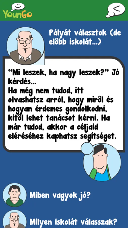 Az alkalmazás segítségével főtémák alá rendezve egyfajta kérdezz-felelek módszerrel tájékozódhatsz, kaphatsz válaszokat, segítséget, iránymutatást, akár a gyermekvédelmi rendszerben élsz még, akár utógondozottként, de akkor is, ha már kikerültél a rendszerből.