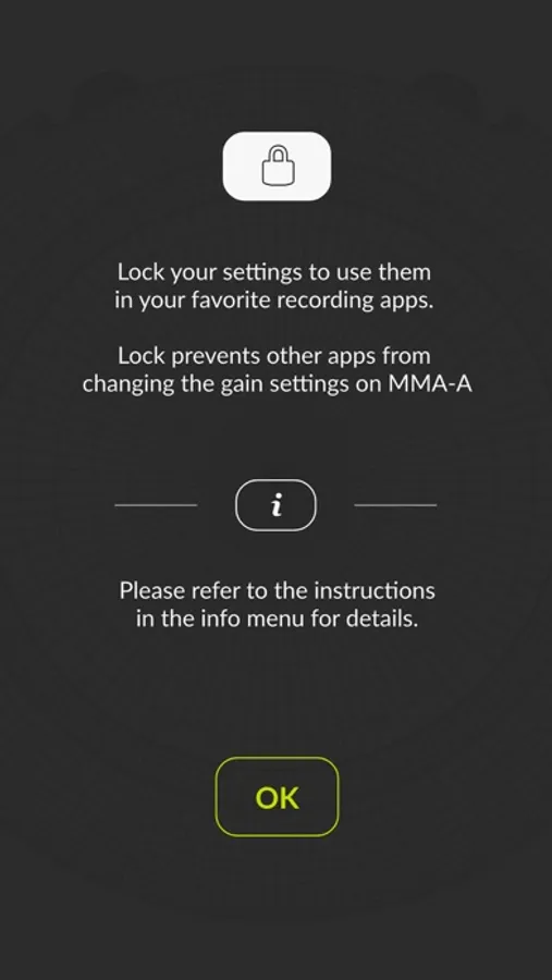 Use the LOCK button to block 3rd party apps from controlling gain. Gain settings can be controlled and saved on the MMA-A for use in your favorite recording / broadcasting apps. The lock button also controls the setting of the low cut filter. Saved locked settings are automatically activated the next time you connect to the MMA-A.
