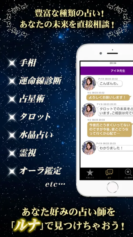 占い師の先生に今抱えている悩みを打ち明けてみましょう。どの先生も親身に相談に乗ってくれるので、先生を選んでみましょう。