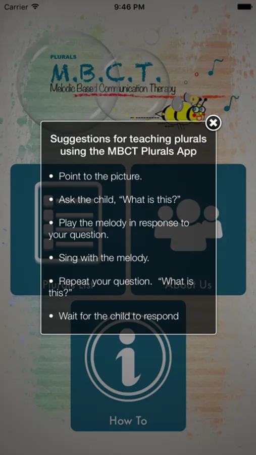 Melodic Based Communication Therapy (M.B.C.T.) Plurals will teach your child over 50 plural and singular terms using a music model. The application includes regular and irregular plurals.