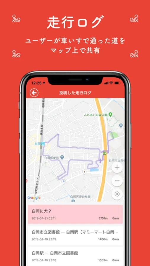 ユーザーが車いすで通った道をマップ上に記録できます。
