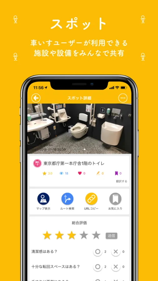 多目的トイレや駐車場、レストランなどの車いすユーザーが利用できる施設や設備などのバリアフリー情報を共有できます。