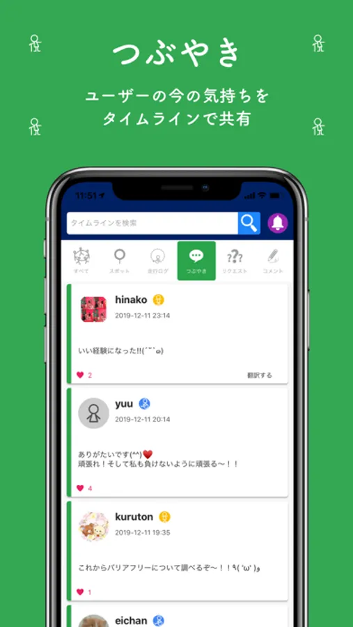 ユーザーが投稿した最新のバリアフリー情報を見ることができます。他のユーザーのつぶやきや投稿に対するコメントも見ることができます。