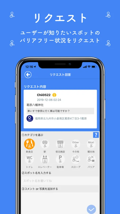 ユーザーが知りたいスポットのバリアフリー状況をリクエストできます。