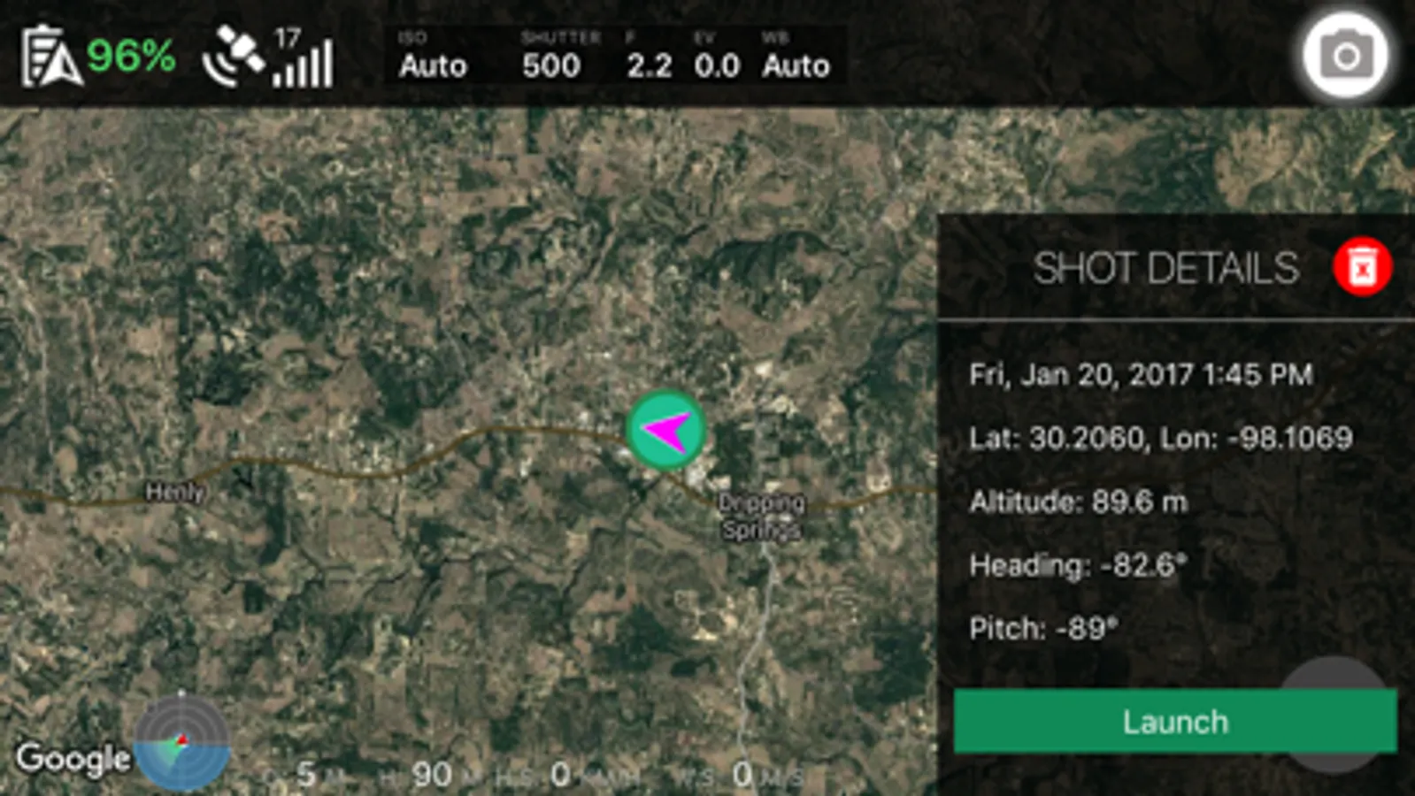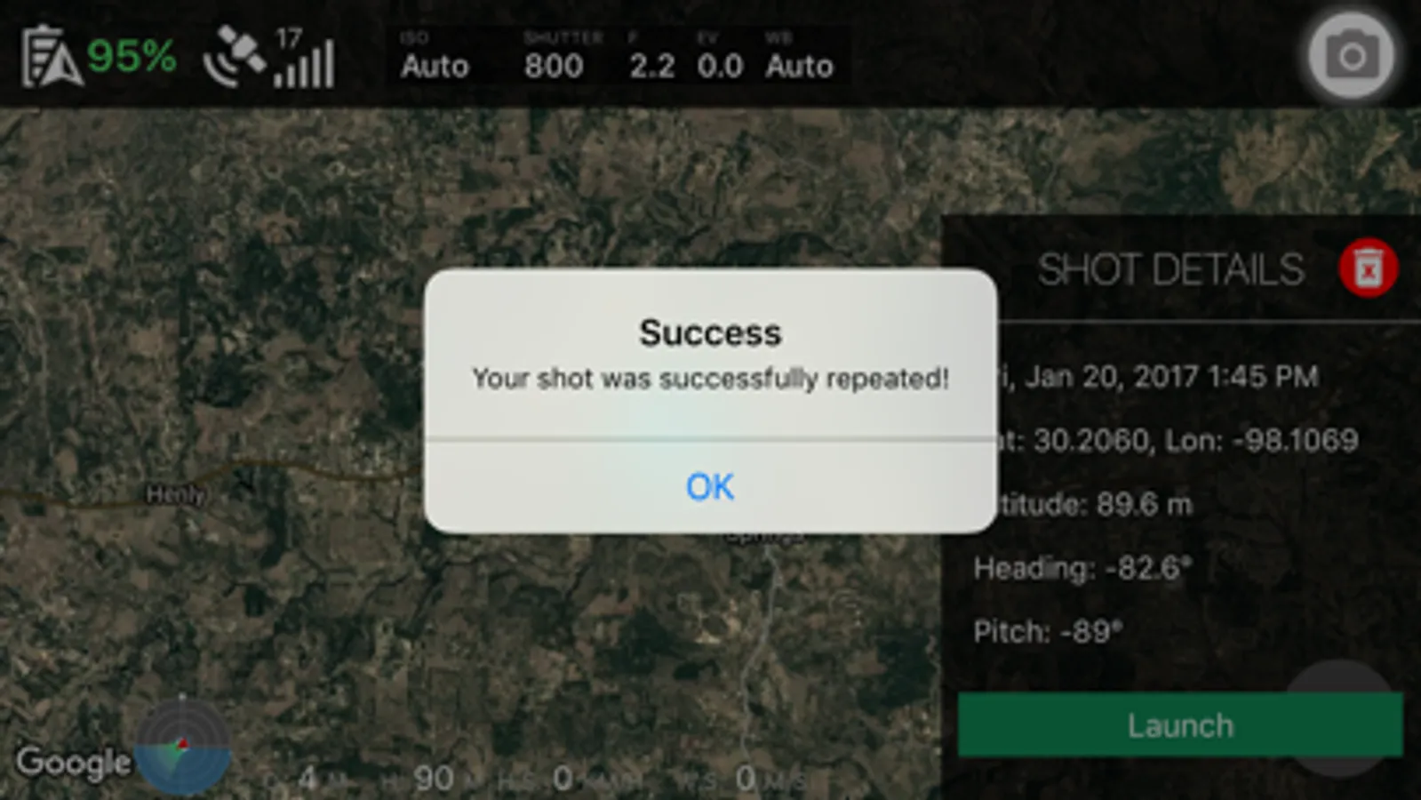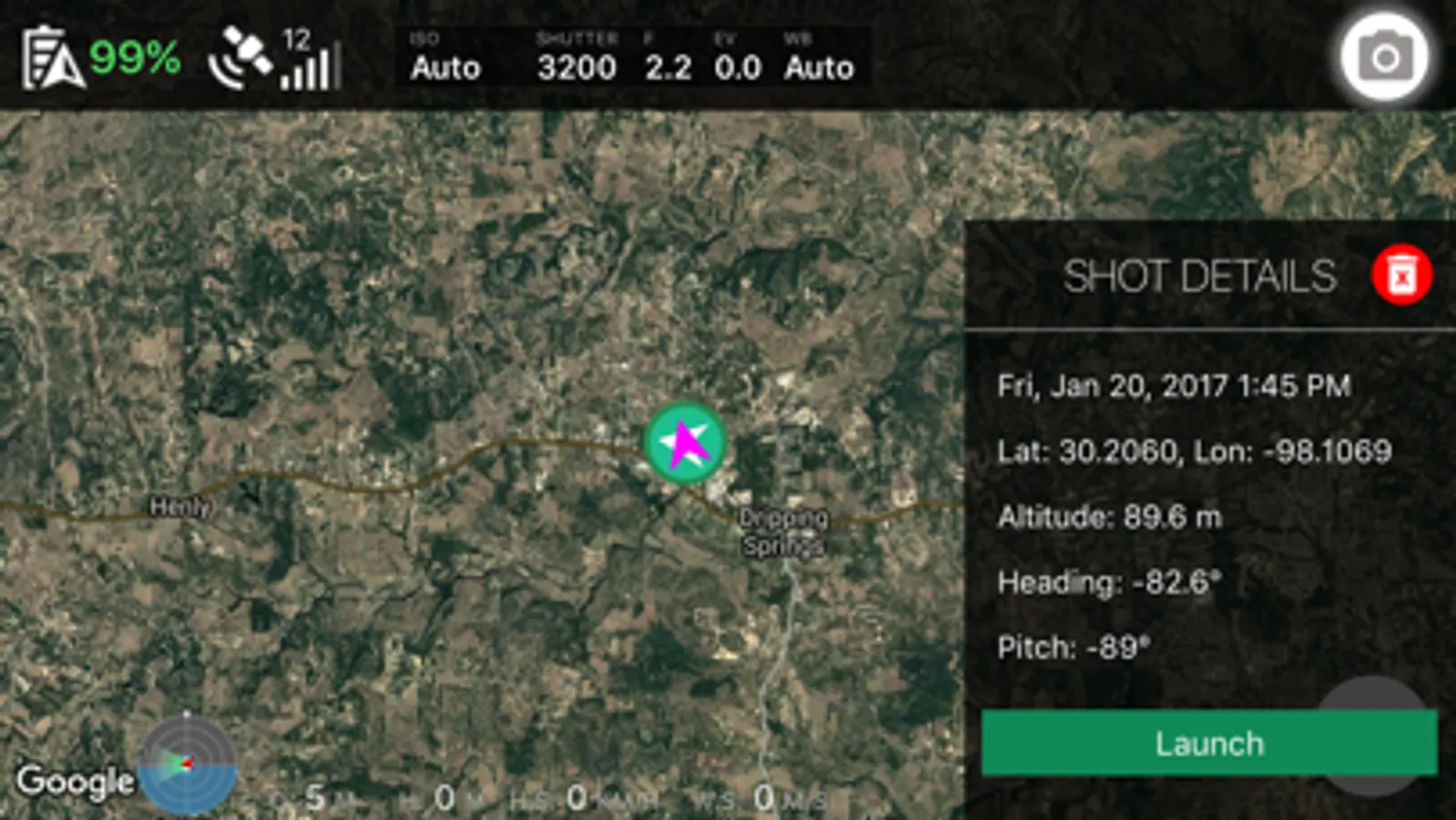 DroneRepeat makes it easy to repeat your drone shots with the click of a button. When you take photo using DroneRepeat it will ask if you'd like to save the shot. This will save the location, altitude, heading and gimbal pitch so the shot can be repeated later.