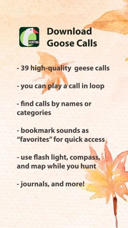 39 high-quality goose calls at your hand - a sweet and powerful tool to help you attract and hunt goose. No ads.