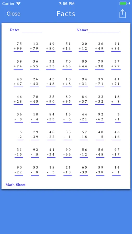 Simple utility to generate math worksheets. It can quickly generate worksheet with random problems and worksheets can be directly printed from iPhone or iPad or can be shared via e-mail as PDF and other sharing options.