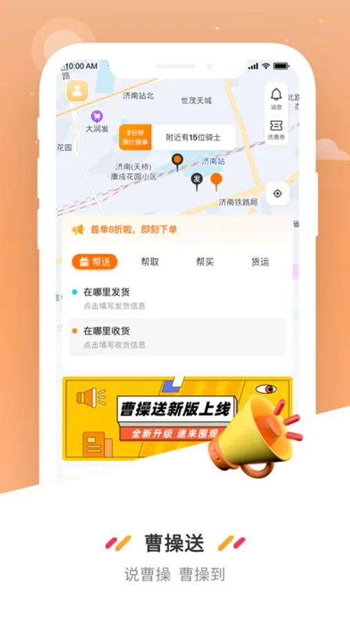 曹操送有专业配送人员和众包跑腿人员。用户在曹操送APP上发布任何配送或跑腿需求,附近的曹操送配送和跑腿人员第一时间就能提供所需服务。同时任何人都可在曹操送平台申请成为自由跑腿人,通过平台派发的跑腿订单赚钱。