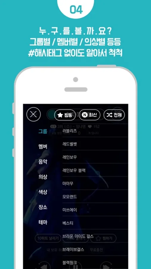 그룹별, 멤버별, 음악별, 의상별, 색상별,