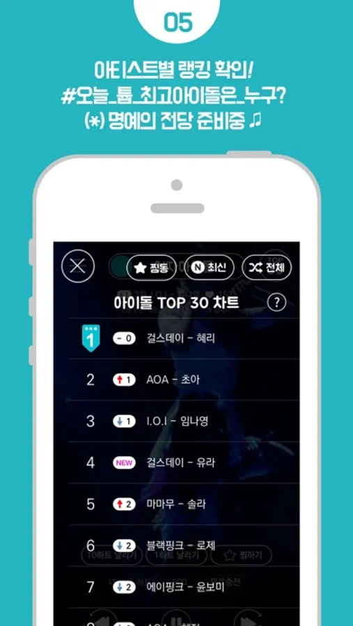 여자/남자 TOP30 아티스트별 랭킹 확인