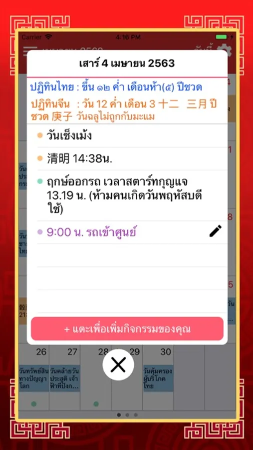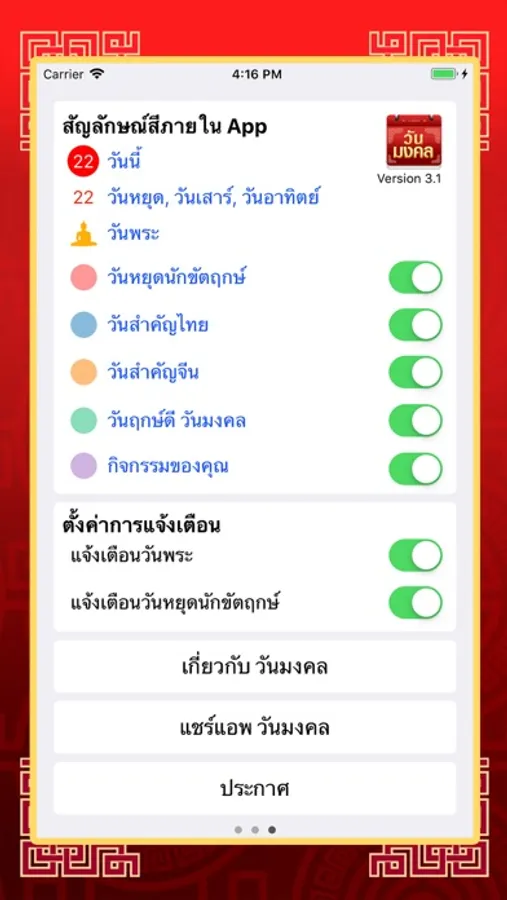 แอพ วันมงคล - Calendar 2023 เป็นแอพ ปฏิทินไทย 2566 ปฏิทินฤกษ์มงคล และ ปฏิทินจีน 2566 ที่ช่วยบอก ฤกษ์มงคล ฤกษ์ดี วันดี ฮวงจุ้ยดี เหมาะสำหรับผู้ที่กำลังมองหาฤกษ์ ขึ้นบ้านใหม่ แต่งงาน เปิดกิจการ ซื้อรถ วันสำคัญของไทย แสดงเทศกาลสำคัญต่างๆ วันหยุดนักขัตฤกษ์ วันพระ บันทึกการนัดหมาย เวลา ในปฏิทิน