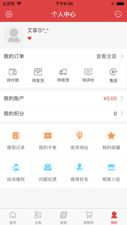 5、我的模块:显示用户的基础信息、个人设置、订单状态等。