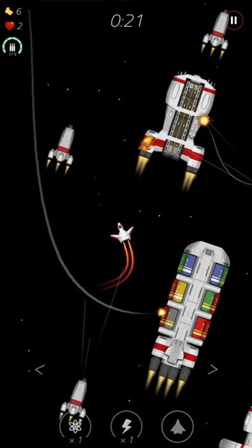 As an astronaut you can choose one of 13 different spaceships equipped with lasers, guns & laser turrets. Different spacecraft have different speed, angles of rotation & ammunition. Collect gold pieces while flying in space & unblock your favourite spaceships! Dodge missiles sent by invisible space invaders, avoid collisions with asteroids & nebulas to survive!