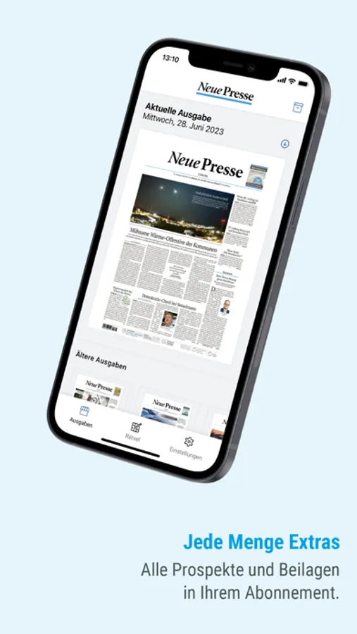Lesen Sie in der digitalen Ausgabe der Neuen Presse täglich das Wichtigste aus der Region und aller Welt. Jetzt früher dran: Die neueste Ausgabe steht Ihnen täglich ab 20 Uhr am Vorabend zur Verfügung. Die NP E-Paper App bringt Ihnen die Zeitung in originalgetreuer Darstellung auf Ihr iPad und iPhone. Die optimierte Benutzeroberfläche fürs digitale Lesen und viele nützliche Zusatzfunktionen bieten täglich ein komfortables Leseerlebnis.