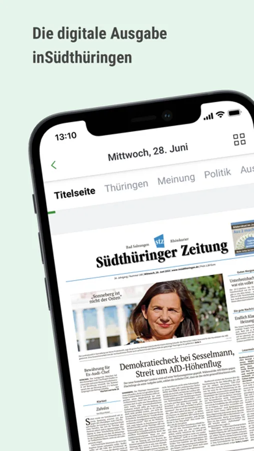 Lesen Sie in der digitalen Ausgabe von inSüdthüringen.de täglich das Wichtigste aus der Region und aller Welt. Jetzt früher dran: Die neueste Ausgabe steht Ihnen täglich ab 20 Uhr am Vorabend zur Verfügung. Die E-Paper App bringt Ihnen die Zeitung in originalgetreuer Darstellung auf Ihr iPad und iPhone. Die optimierte Benutzeroberfläche fürs digitale Lesen und viele nützliche Zusatzfunktionen bieten täglich ein komfortables Leseerlebnis.