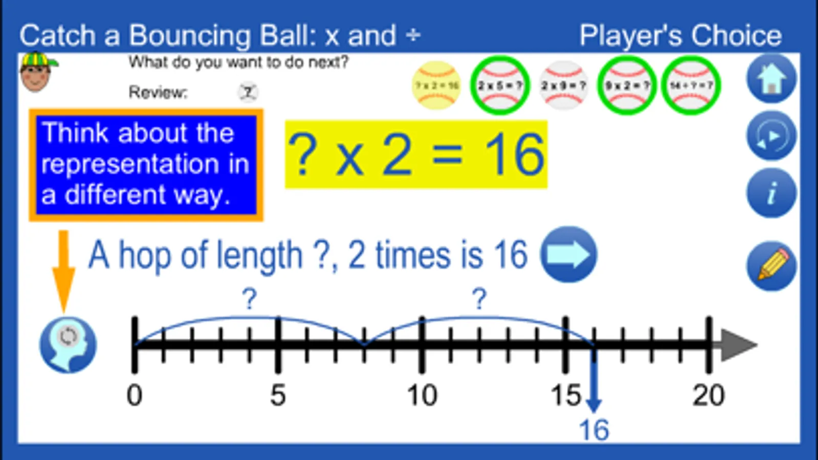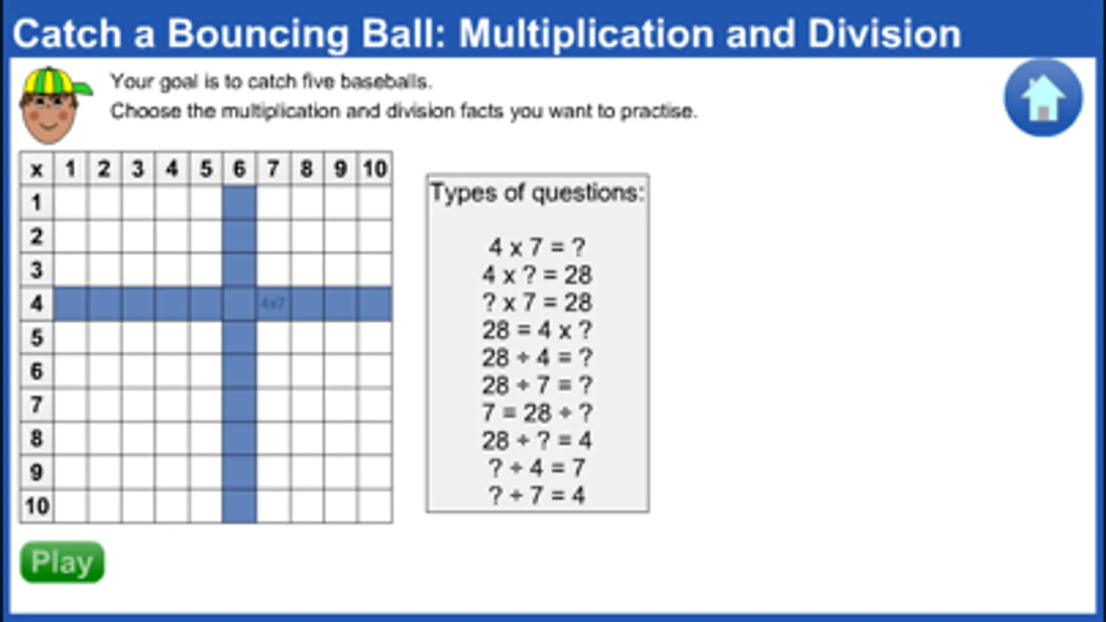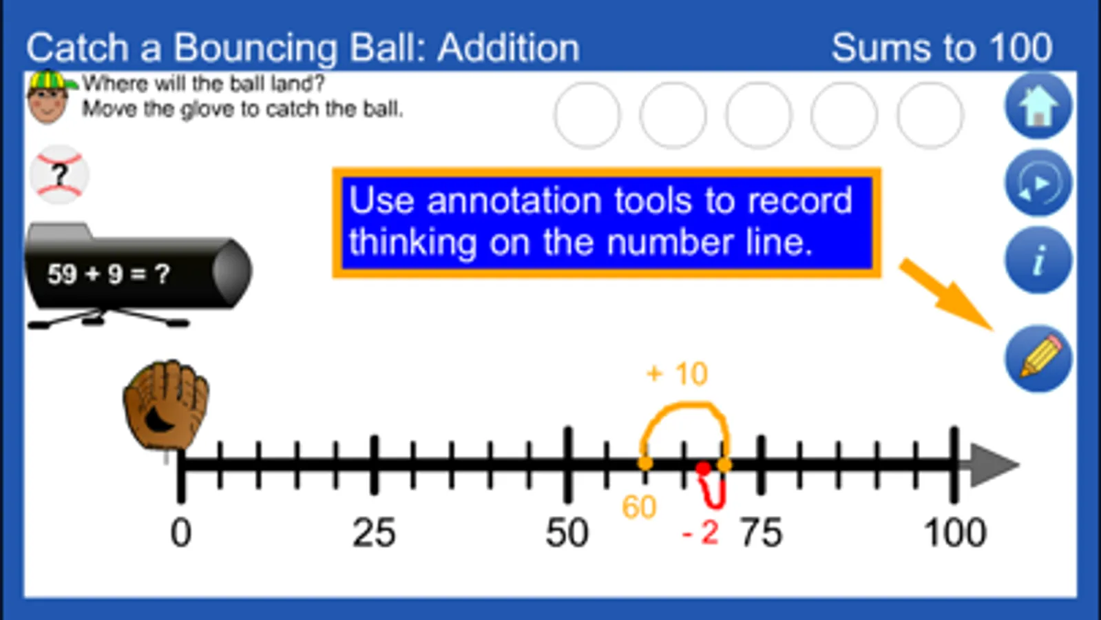 Catch a Bouncing Ball Operations by mathies is a game that provides opportunities to practise the fundamental skills of addition, subtraction, multiplication or division. For single operation games the unknown value is the result (e.g., 3 + 5 = ?). For mixed operation games the position of the unknown value changes (e.g., 3 + ? = 8). The player determines the unknown value and drags the glove to the correct answer on the number line.