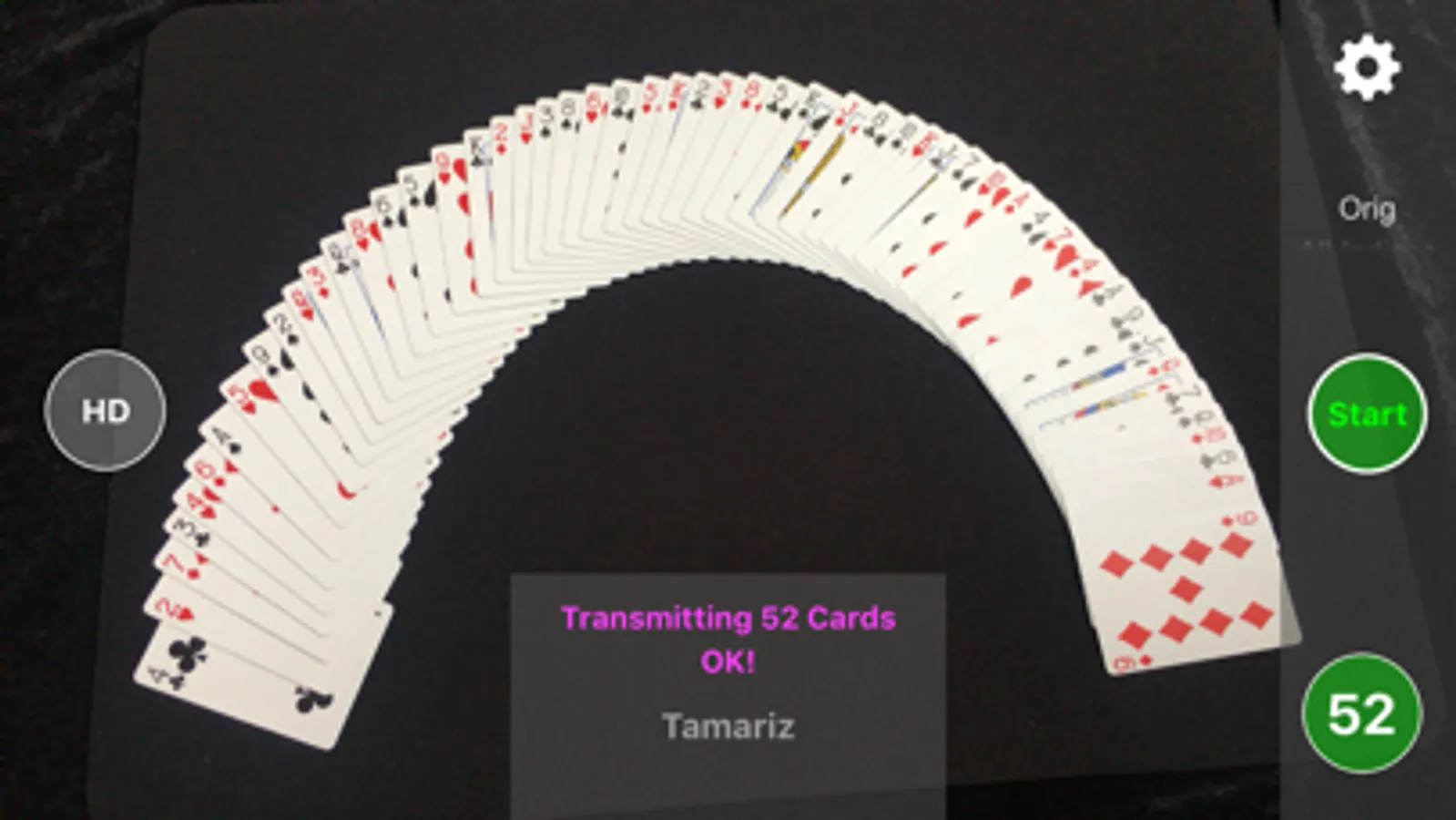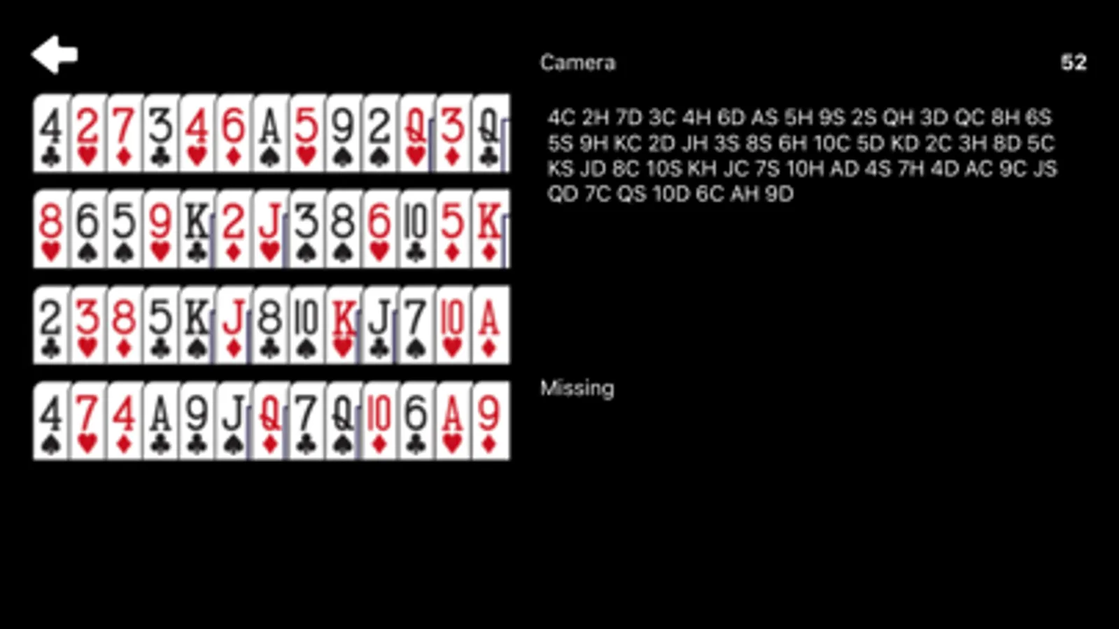 A face-up spread of playing cards can be captured via the video-stream from the back camera of the iPhone. The order of the playing cards will be detected and can be displayed. All missing cards can be displayed too.