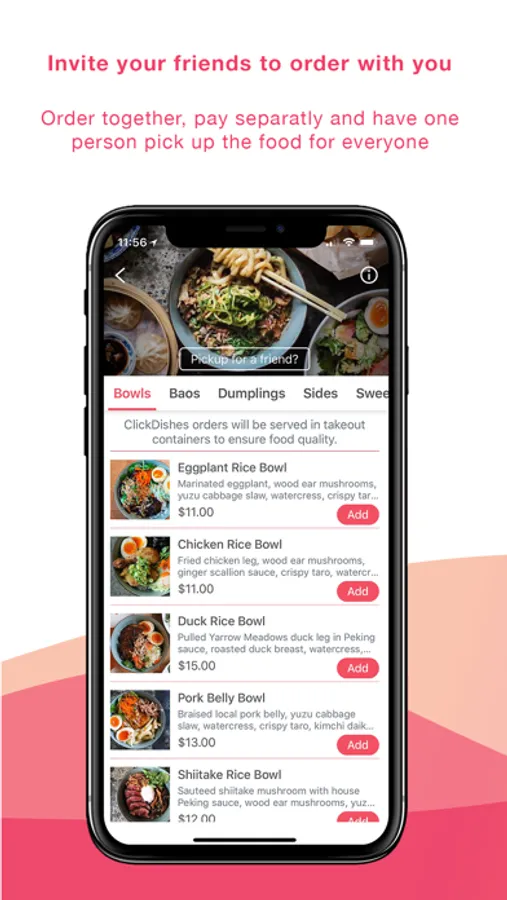 The prices listed at the restaurant will mirror the prices on ClickDishes. Plus, you can invite your friends to place orders at the same restaurant you are ordering from! Use this friend-powered pick up to get your friends to bring food or coffee back to you without having to worry about them getting your order right or handling payments.