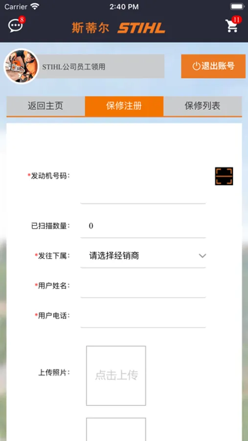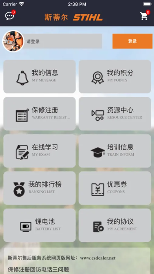 用于斯蒂尔产品的经销商售后服务系统,包括产品保修注册、积分管理、积分兑换零配件、销售商信息、质量索赔、技术资料学习等功能。