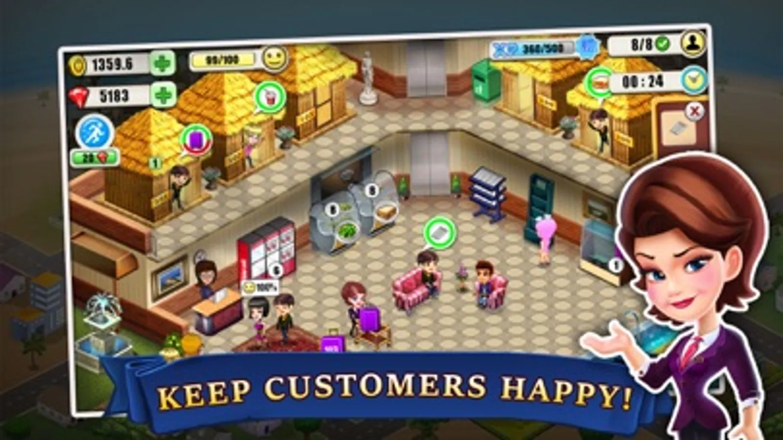 Kick start your hotel management career, keep the customers happy and earn money to buy resorts all over the paradise city and create your own chain of dream hotels. But don’t forget to keep your business strategies updated by adjusting your own demand and the profit’s for the items you sell in your supermarket.
