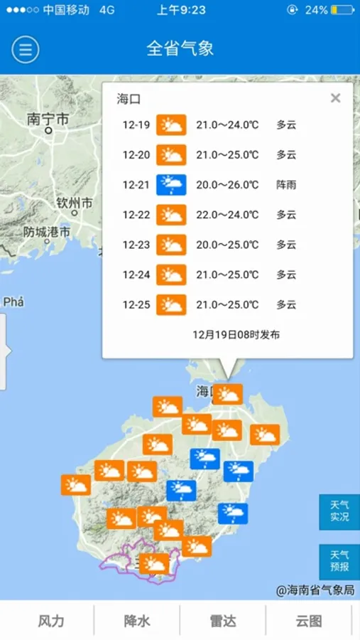 3.“预报预警”提供城镇天气预报、乡镇天气预报、旅游景点预报、海洋天气预报、短时临近天气 预报以及历史预警信息查询服务;