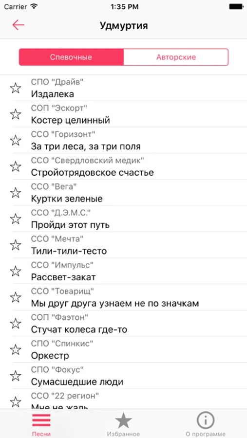 - Два списка песен: “Спевочные” - песни со спевок, и “Авторские” - песни отрядов данного региона;