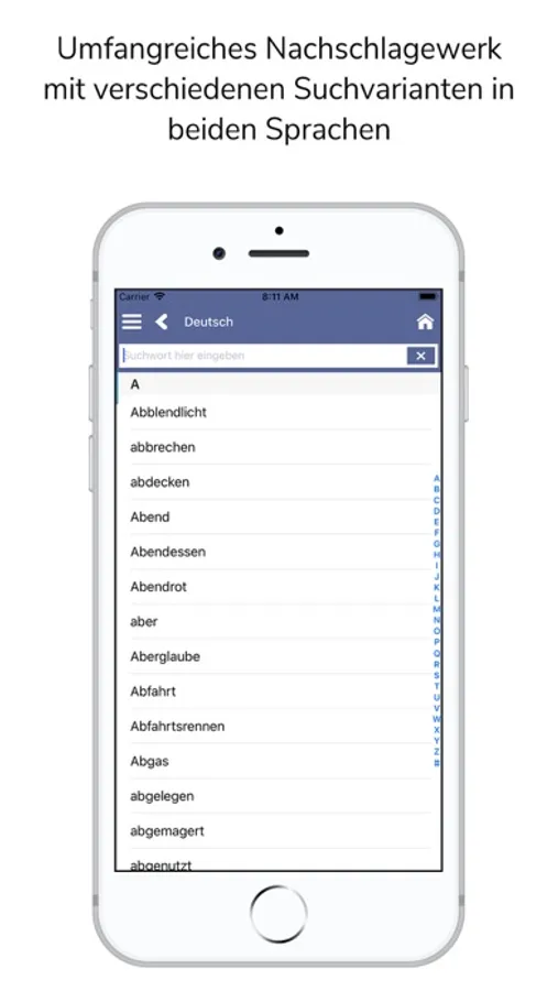 10‘000 Einträgen zum Nachschlagen bereit. Klicken Sie auf das Symbol 'Lautsprecher' hören Sie die korrekte Aussprache. Die App verfügt zusätzlich über einen Prüfmodus. Hier können Sie Erlerntes abfragen und noch nicht Verinnerlichtes markieren - zum spezifischen Training.