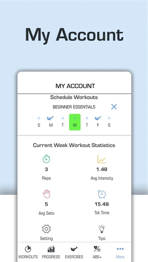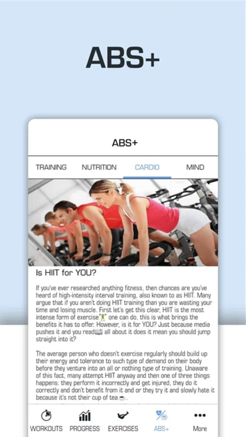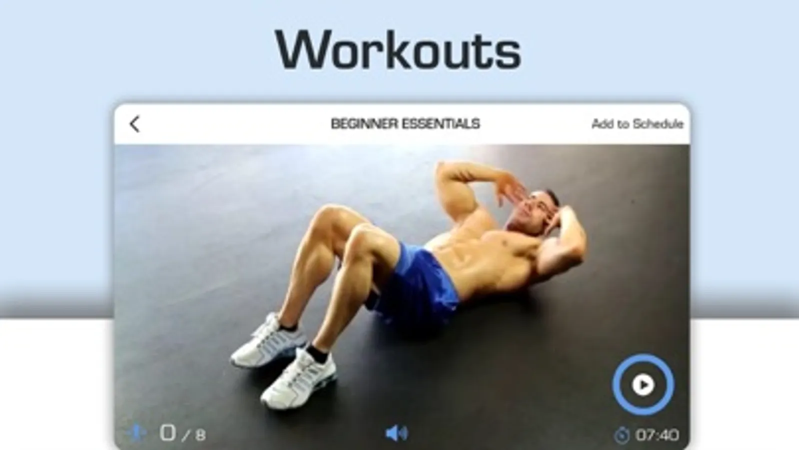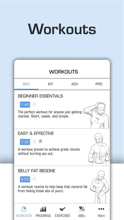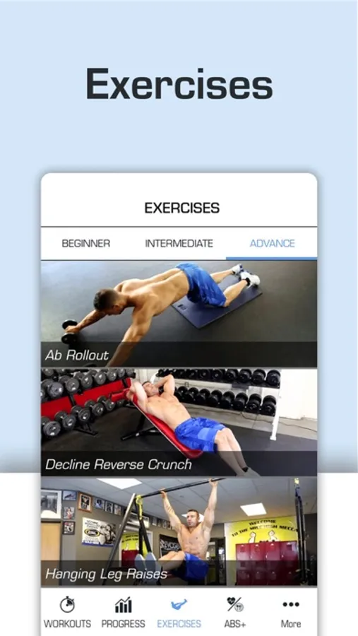 The EXERCISES page gives you access to video demonstrations, details, and instructions on more than 25 ab-related exercises. Some are more challenging than others so make sure you check the level of skill recommended before attempting any of them. To learn more about an exercise, just tap on it.