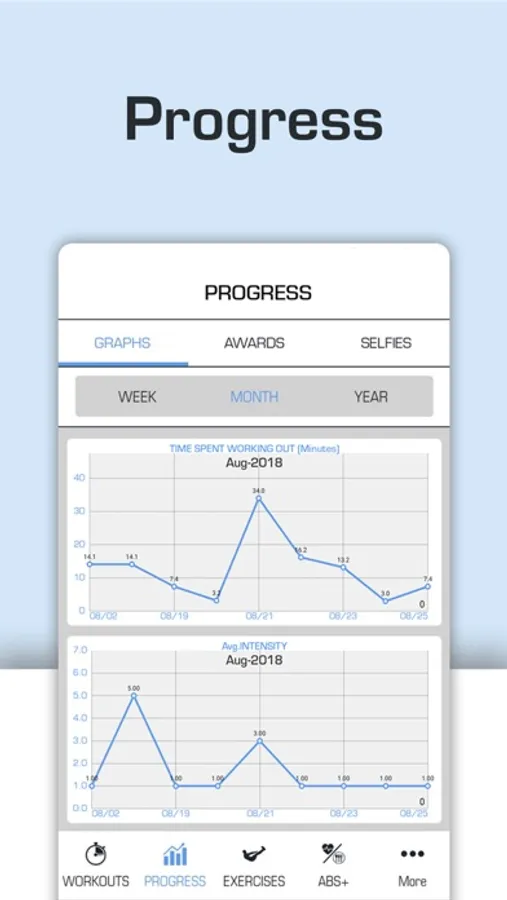 The PROGRESS page is where all of your tracked data is stored. Knowledge is power and knowing which workouts and exercises have made the biggest impact on your body is critical to your progress. This page not only allows you to review all of your workout activity, but it can also provide a day-to-day visual breakdown of your progress via the Selfie timeline.
