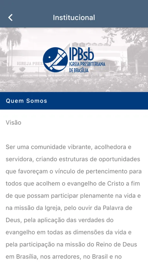 A Igreja Presbiteriana de Brasília é uma comunidade cristã que, alinhada com os princípios da teologia reformada, existe para adorar a Deus e servir à sociedade, vivendo e proclamando o Evangelho de Cristo com vistas à renovação espiritual, cultural e social de Brasília.