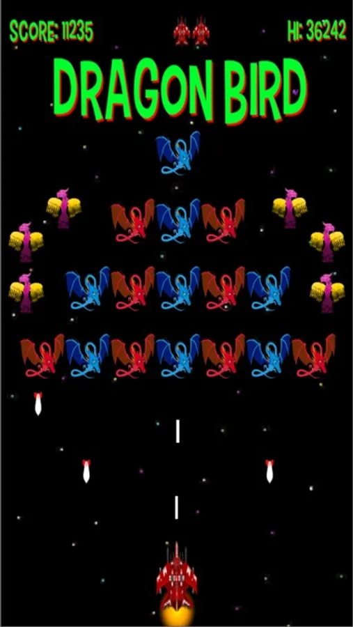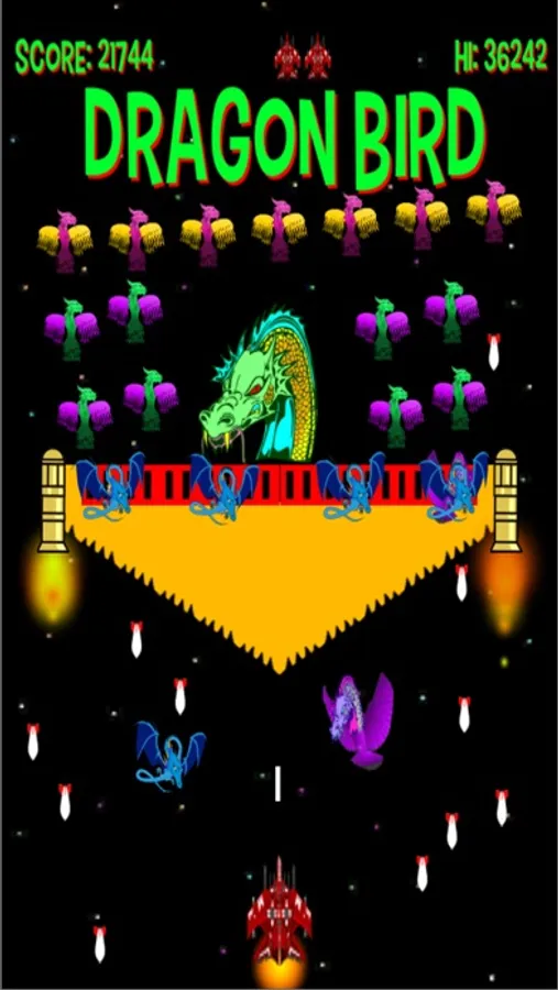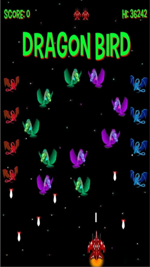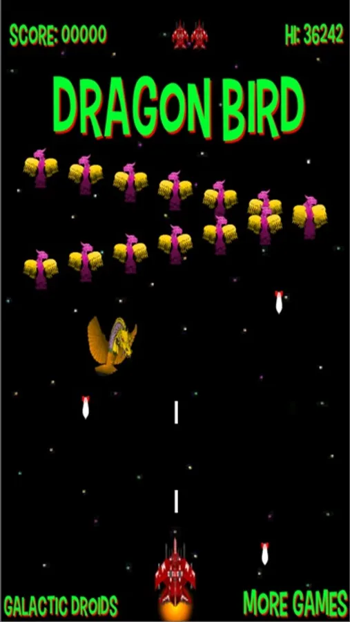 There are lot of aliens to shoot in this old school space invaders style game, of course that means that there are lots of invaders shooting back at you ! You'll need quick reactions, skill, and perhaps a little luck if you are to defeat the phoenix Dragon Bird.
