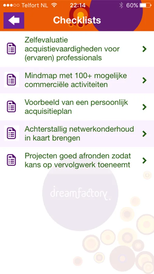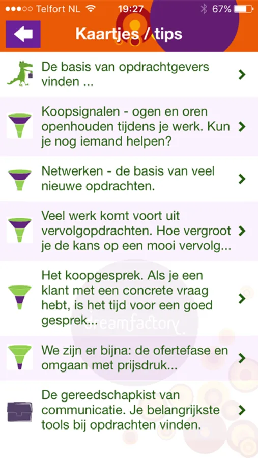 Steeds vaker kwam de roep om een app, om zo die tips altijd via je telefoon bij je te hebben. En dan natuurlijk altijd de laatste versie, want er komen elke maand tips bij. En handig gesorteerd. En dan liefst ook nog een paar videofragmenten. En het zou wel handig zijn om ook de boekentips paraat te hebben, inclusief bestel-link. En natuurlijk ook de checklists die je kunt gebruiken. En dan ook graag een format hoe je een persoonlijk plan maakt…