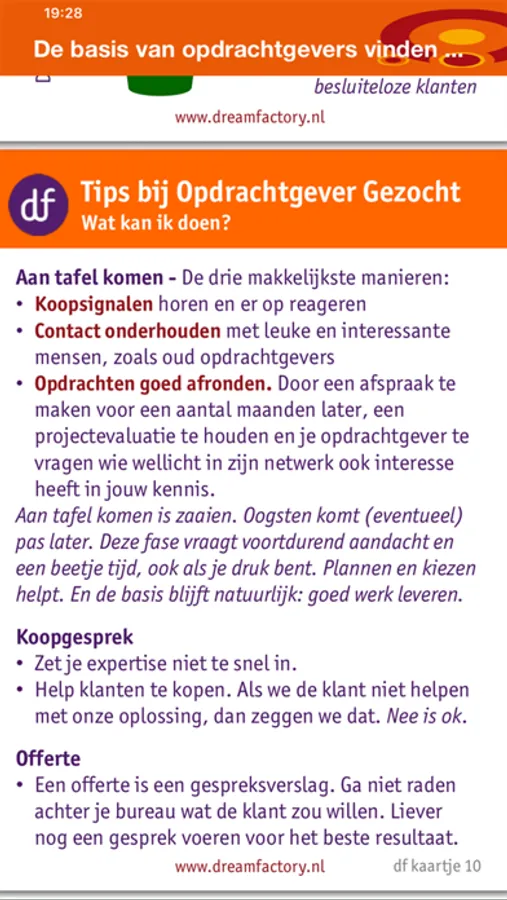 Al jaren verzamelen we daarom de beste tips als het gaat om het vinden van opdrachten voor jezelf en je collega’s. Lezers van onze boeken, en deelnemers aan onze trajecten en workshops, blijken de kaartjes met die concrete tips zeer te waarderen. Om even te raadplegen vlak voor een klantgesprek bijvoorbeeld.
