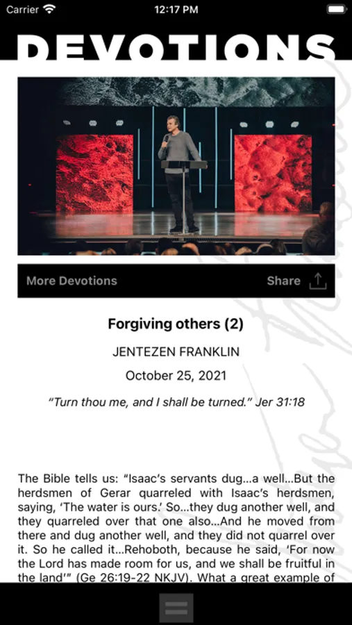 Start your day inspired, encouraged, and motivated to be the best version of yourself with Jentezen Franklin’s Daily Devotions. Experience brand new video and podcast messages on the go each week! The Jentezen Franklin Ministries APP is free and easy to use. Create a free account to save your favorites, watch and listen as often as you like, and share devotions and messages with your friends right from your phone.