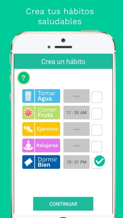 • Crea hábitos saludables con fácilmente, tomar agua, comer fruta, hacer ejercicio, relajarte o dormir suficiente, elije el hábito que quieres tener y consíguelo con la función de “crear hábitos”