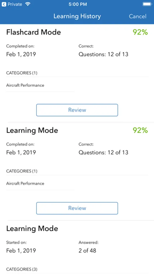 After completing each test your results are saved in the app's Progress Report section, where you can review previous scores and and a detailed history of each question and answer selection. You can also pause a partially-completed session, and resume it at a later time here.