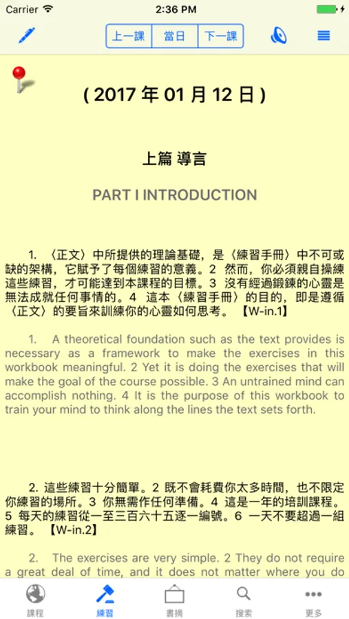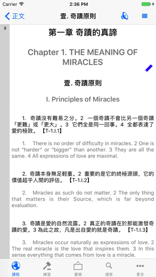 奇蹟課程學習輔助工具。這是一款集中英文對照、搜索、語音朗讀、閱讀痕跡、閱讀摘要,閱讀筆記、微信發佈等多種功能於一體的奇蹟課程學習軟體。對於想要深入學習奇蹟課程的用戶來說,是一個非常好的選擇。