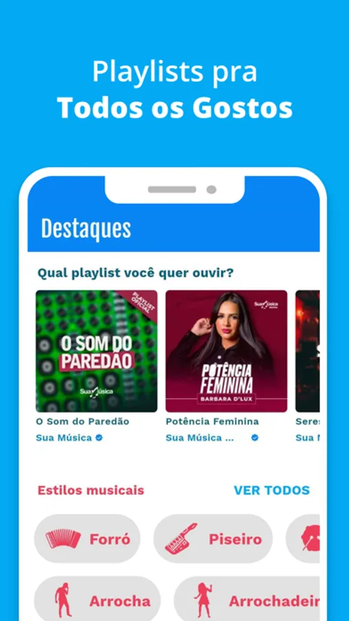 - Acesso à várias playlists de Forró, Piseiro, Funk, Arrocha e muito mais;