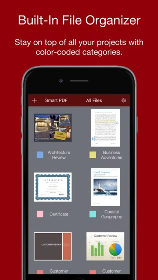Keep all your files organized with the built-in file manager, with color-coded categories.