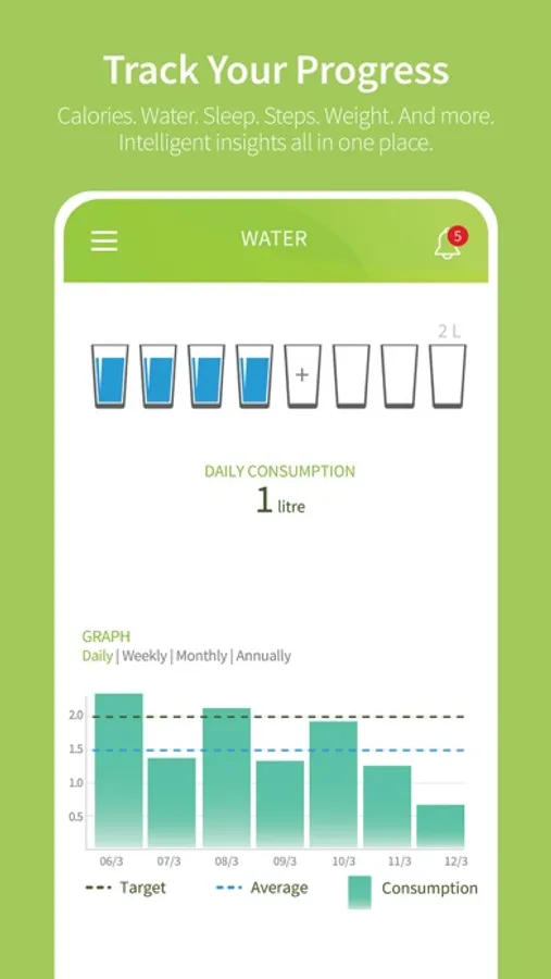 * Track your progress - water, calories, sleep, steps, feelings, heart rate and more.