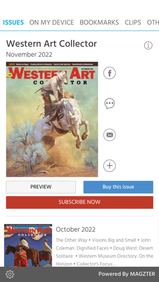 With previews of gallery exhibitions, museum shows and auctions, Western Art Collector is the premier monthly magazine for collectors searching for works by talented living and past artists who depict the West in paintings and sculptures.