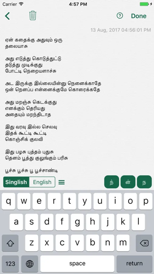 'Tamil Notes' is the easiest and fastest way to write in Tamil letters using existing English keyboard. You don't have to install any other keyboard apps or other web-based Tamil Unicode writers anymore.