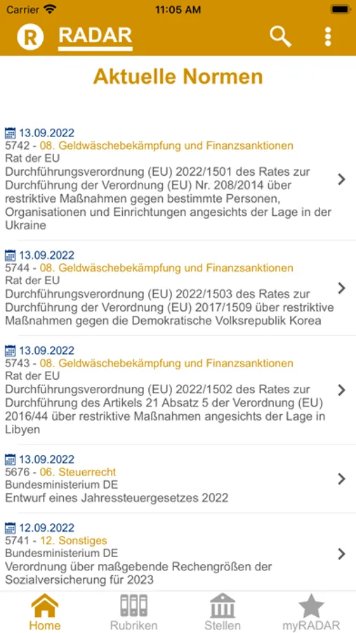 Die aus der Web-Anwendung bekannten RADAR-Informationen stehen Ihnen jetzt auch über die RADAR-App zum jederzeitigen Abruf zur Verfügung (online-Verbindung vorausgesetzt). Nutzen Sie die Kompetenz unseres erfahrenen Teams für Ihre regulatorische Compliance und greifen Sie auf die Informationen bequem von Ihrem Mobilgerät zu.